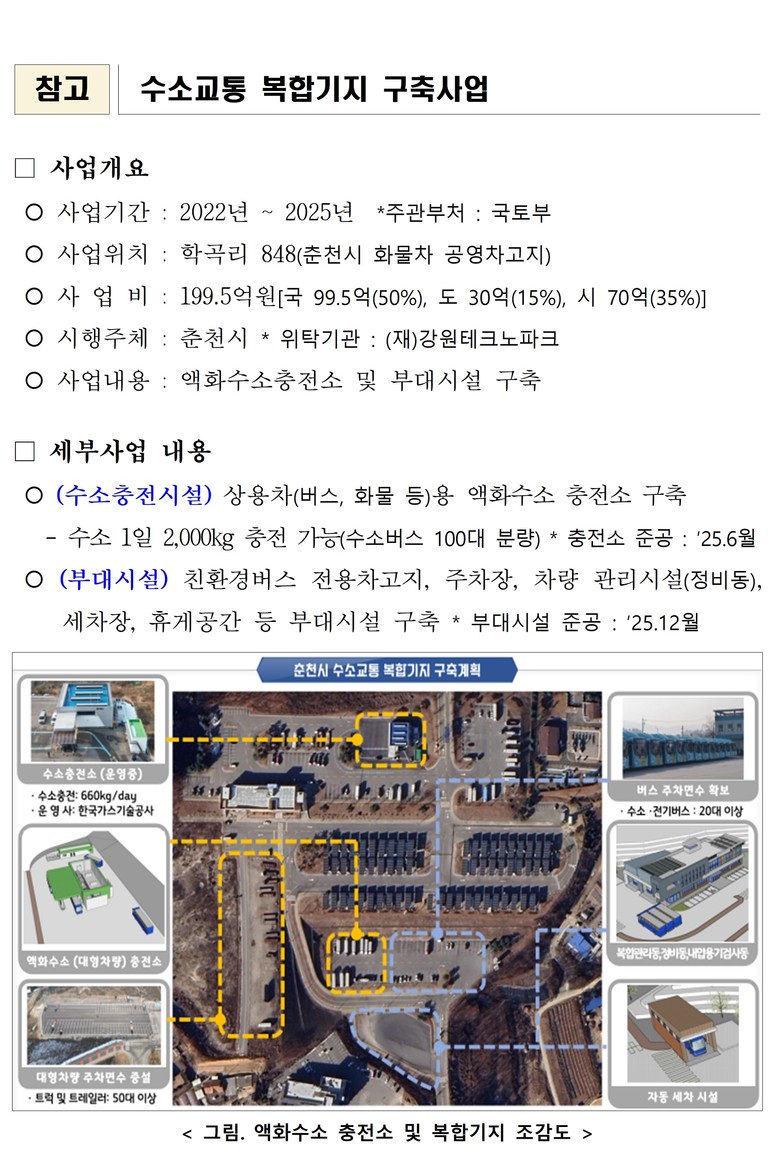 수소교통 복합기지 구축사업은 춘천시 동내면 학곡리 화물차 공영 차고지에 액화수소충전소와 부대시설(복합관리동, 정비시설 등)을 구축하는 사업으로 2022년부터 총사업비 199.5억 원(국비 99.5, 도비 30, 시비 70)이 투입되었다.