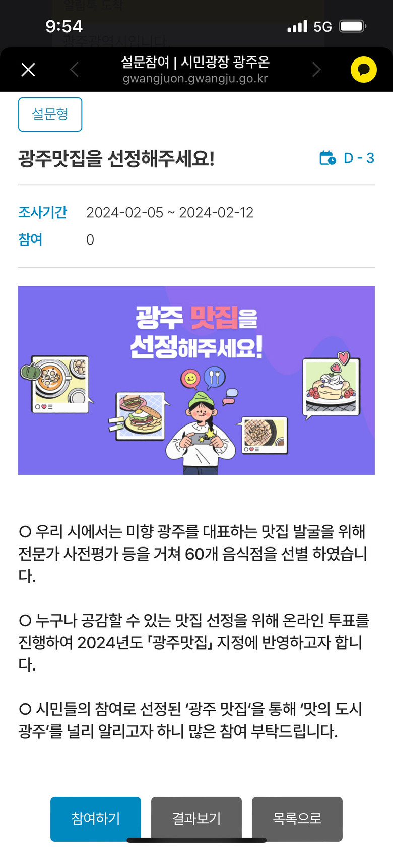 광주광역시(시장 강기정)는 2024년 ‘광주 맛집’ 선정을 위한 온라인 설문조사를 5일부터 12일까지 실시한다.