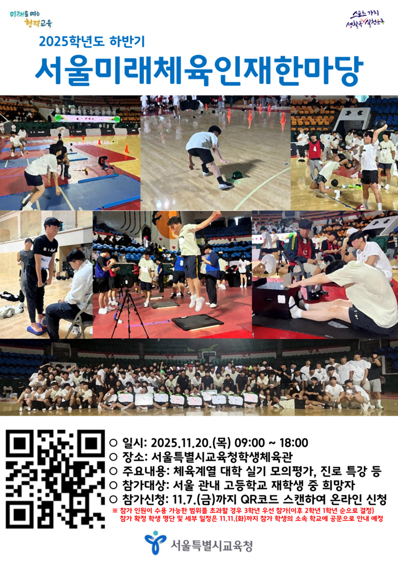 이어 11월 20일(목) 서울특별시교육청학생체육관에서 「2025학년도 하반기 서울미래체육인재한마당」을 개최한다.