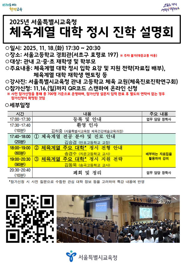 먼저, 11월 18일(화) 서울고등학교에서 「2025년 서울특별시교육청 체육계열 대학 정시 진학 설명회」를 개최한다.