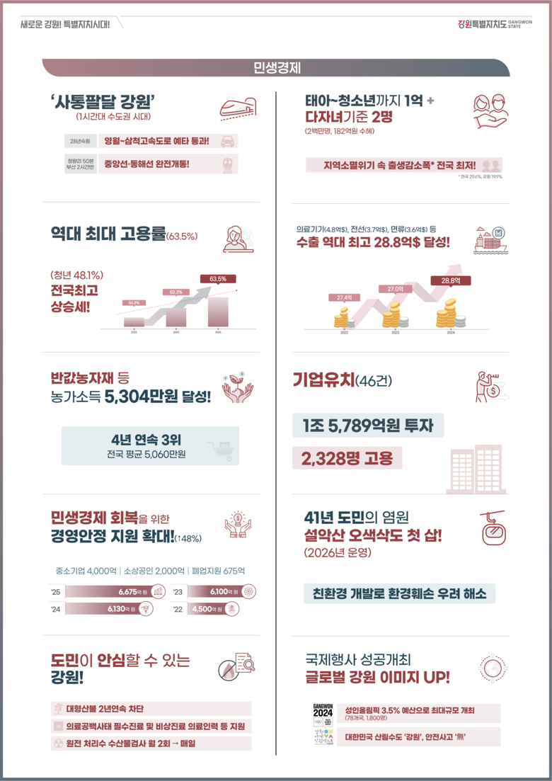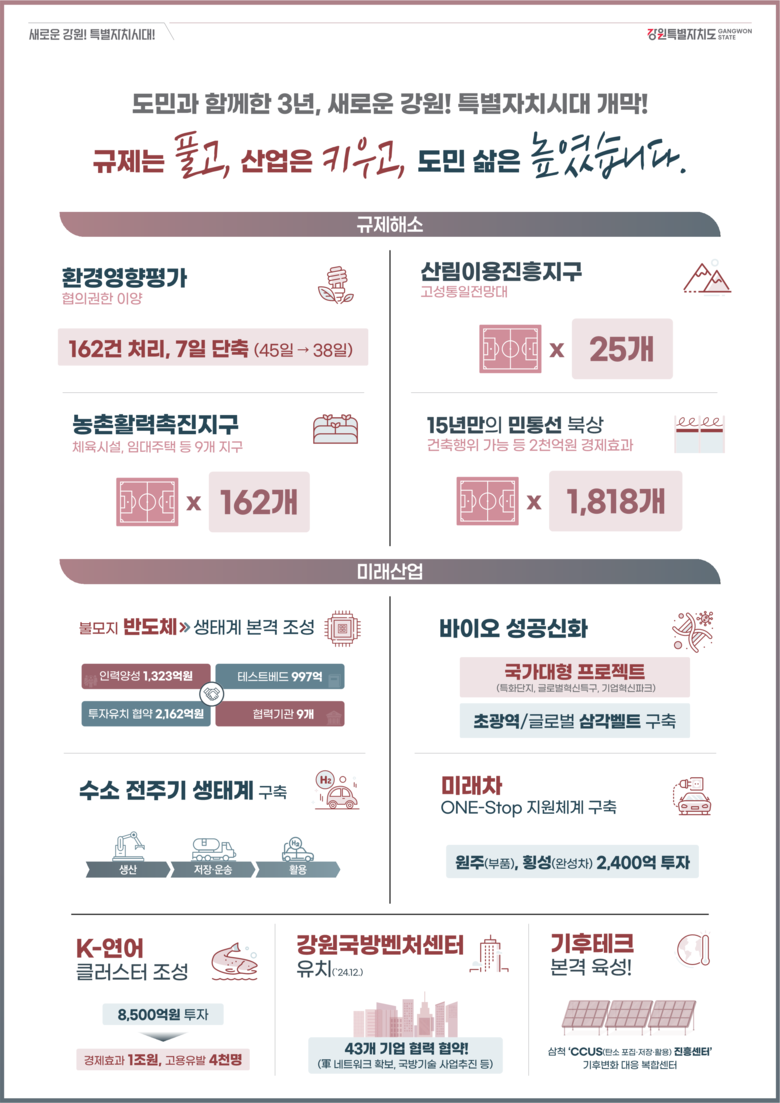 김진태 도정은 특별자치시대 개막과 함께 ‘규제는 풀고, 산업은 키우고, 도민의 삶을 높이는’데 중점적으로 도정을 운영해 왔다.