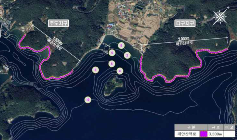 창원 주도·다구지구는 진동면 요장리~다구리 일원에 해안산책로(L=3,500m)를 조성하는 사업이다. 대상지는 남파랑 둘레길(남파랑길 11코스)에 해당해 이용객이 증가하는 곳이나, 해안산책로가 단절돼 있어 지역 주민과 관광객들에게 불편과 위험을 초래하고 있었다.