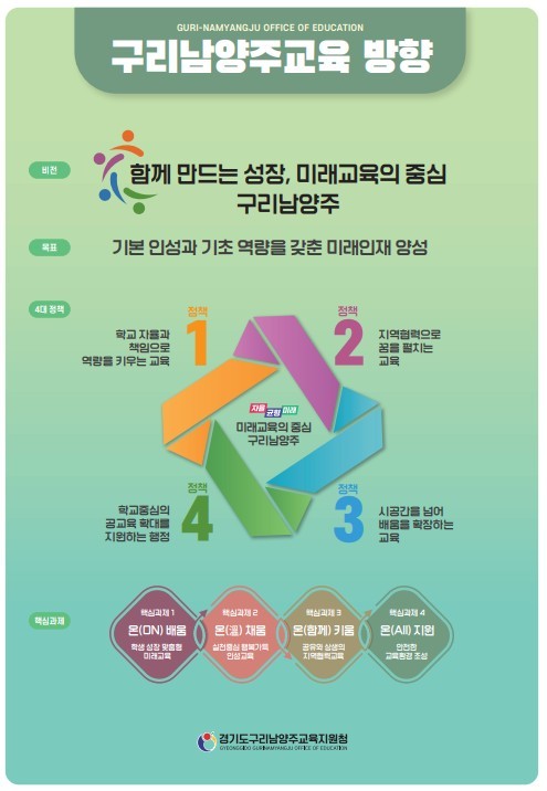 2026 구리남양주교육의 비전은 교육정책과 사업의 연속성을 유지하고 방향성을 명확히 하기 위해 ‘함께 만드는 성장, 미래교육의 중심 구리남양주’로 정하였다. 우리 지역의 모든 학생들이 저마다의 미래를 준비할 수 있도록 ▲온(ON) 배움, 학생성장 맞춤형 ▲온(溫) 채움, 실천중심 행복가득 인성교육 ▲온(함께) 키움, 공유와 상생의 지역교육협력교육 ▲온(All) 지원, 안전한 교육환경 조성으로 구리남양주의 4대 핵심과제를 선정하였다.