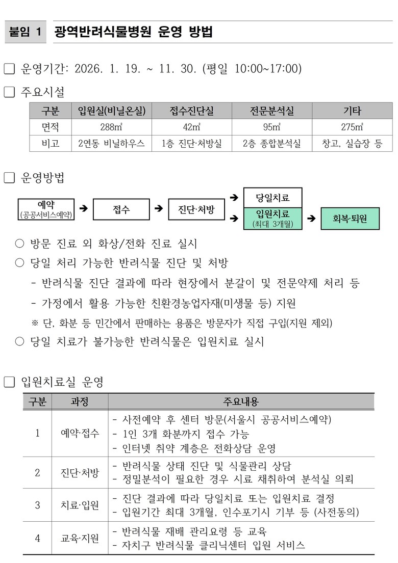 반려식물병원 이용은 무료이며, 서울시 공공서비스예약 누리집을 통해 사전 예약 후 방문하면 된다. 예약은 평일 10시부터 17시까지 30분 단위로 가능하며, 선착순 마감된다.