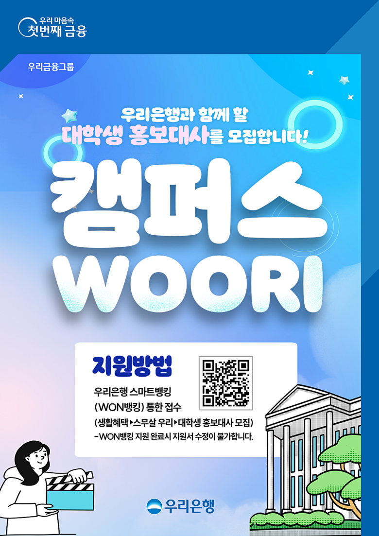우리은행은 명칭 공모전을 통해 대학생 홍보대사를 ‘캠퍼스WOORI(이하 캠우리)’라고 이름 짓고, 오는 23일까지 대학생 홍보대사를 모집한다.