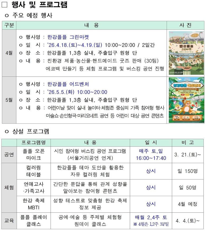 계절과 대상에 맞춘 다양한 행사도 이어질 예정이다. 4월 18일(토)~19일(일)에는 친환경 마켓과 체험, 버스킹 공연이 결합된 ‘한강플플 그린마켓’이 진행된다. 5월 5일(화) 어린이날에는 체험형 놀이와 뮤지컬 공연 콘텐츠가 어우러진 ‘한강플플 어드벤처’가 펼쳐진다.
