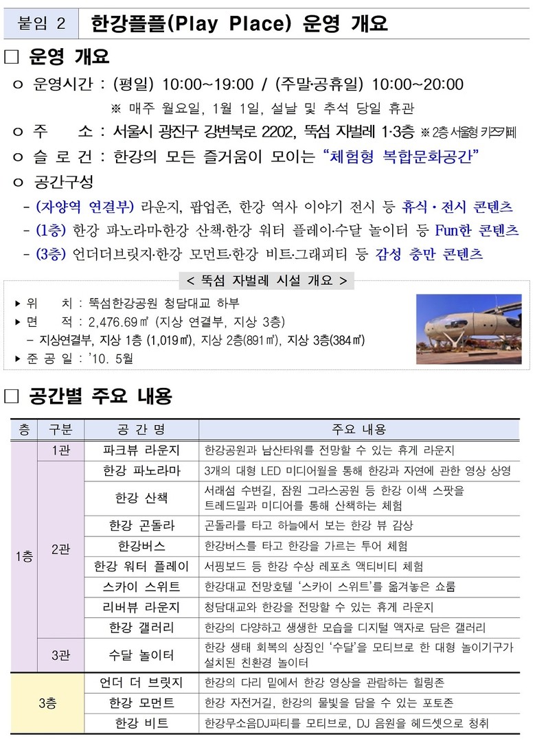 한강플플은 ‘한강의 모든 즐거움이 모이는 체험형 복합문화공간’을 슬로건으로, 한강을 배경으로 체험·전시·휴식·공연 콘텐츠를 결합한 공간이다. 1층에는 미디어 기반 체험 콘텐츠와 놀이시설, 3층에는 한강을 주제로 한 영상과 음악을 즐길 수 있는 힐링형 콘텐츠가 조성되어 다양한 연령층이 함께 즐길 수 있도록 구성되어 있다.