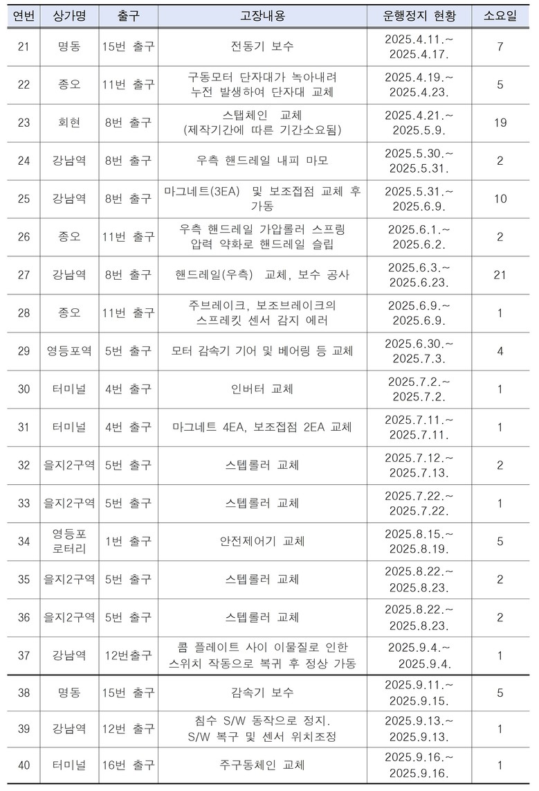 반면 40건 중 28건은 1~6일 내 수리가 가능했으나, 일부 구간에서는 고장이 반복되고 중단 기간이 길어지는 문제가 지속되는 것으로 지적된다.