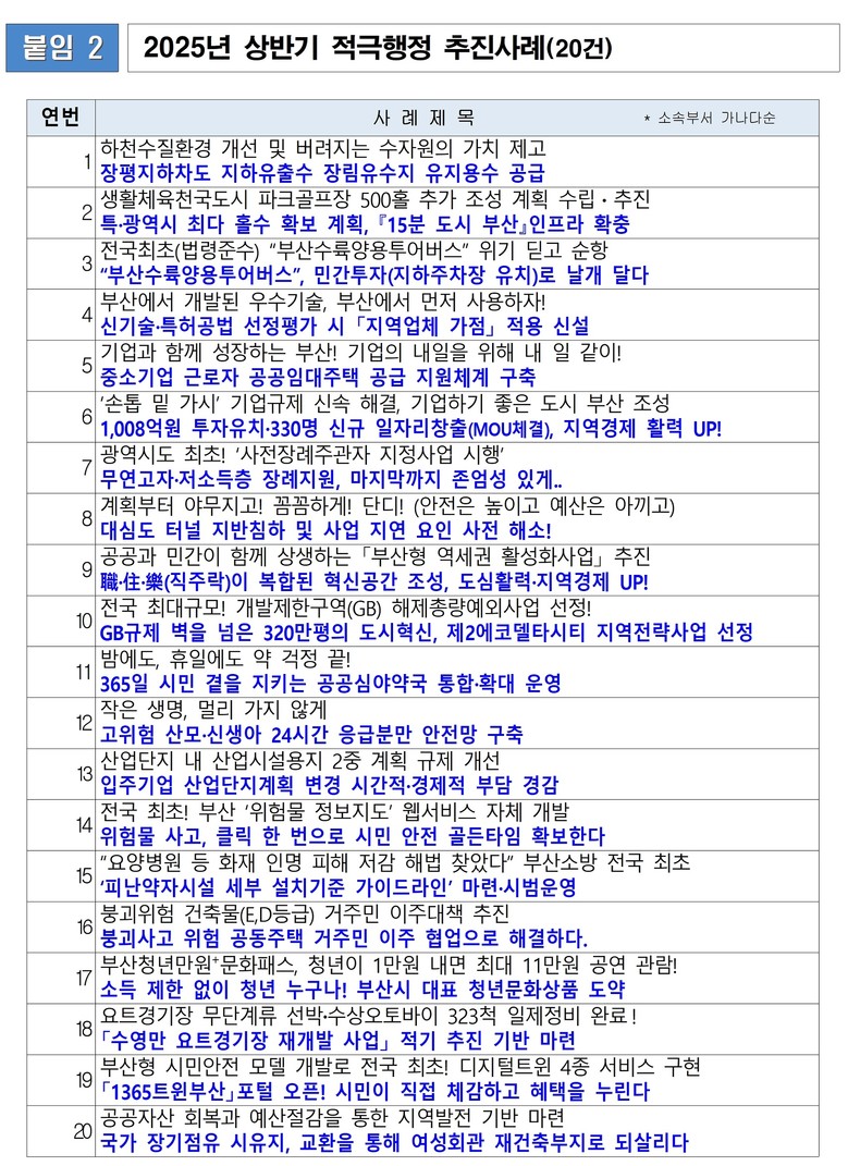 이번 선발 과정에 참여하고 싶은 시민은 투표 기간에 시 누리집 설문조사(www.busan.go.kr/minwon/survey)를 통해 투표할 수 있으며, 내부 심사를 통과한 적극행정 우수사례 20건 중 10건을 선택하면 된다.