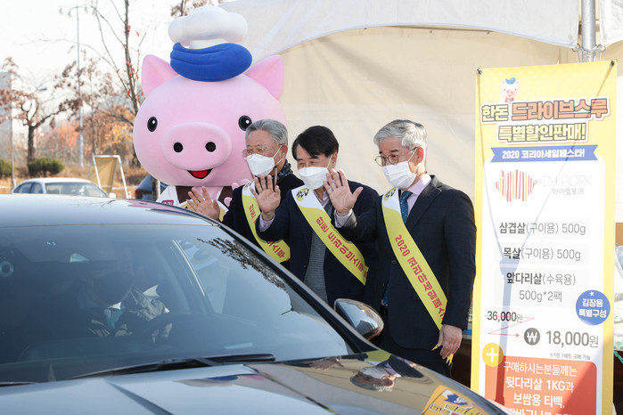 지난 12일 경마공원 드라이브스루 특별 행사장에서 한국마사회 김낙순 회장은 하태식 대한한돈협회장 · 임영호 농축산연합회장과 함께 코세페 홍보와 경제위기 극복을 응원하기 위한 ‘엄지척 챌린지’에 참여했다.