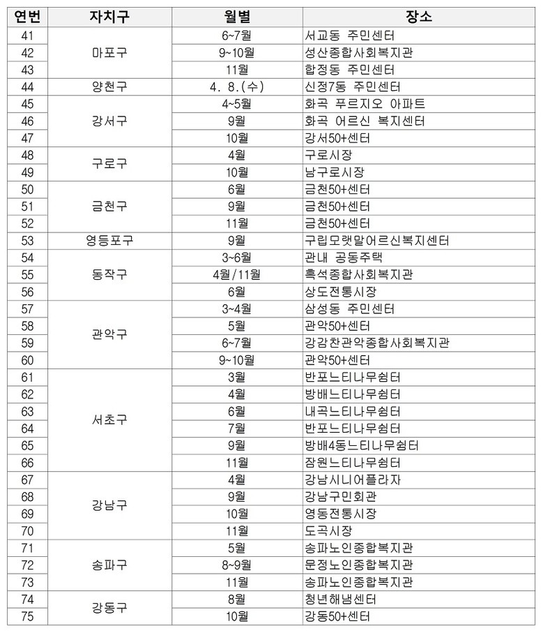 장소는 시민 접근성이 높은 복지관, 전통시장, 주민자치센터, 아파트 커뮤니티 시설, 50+센터, 쉼터 등으로 다양화하여, 생업 등으로 시청·구청 방문이 어려운 시민도 편리하게 상담받을 수 있도록 했다.