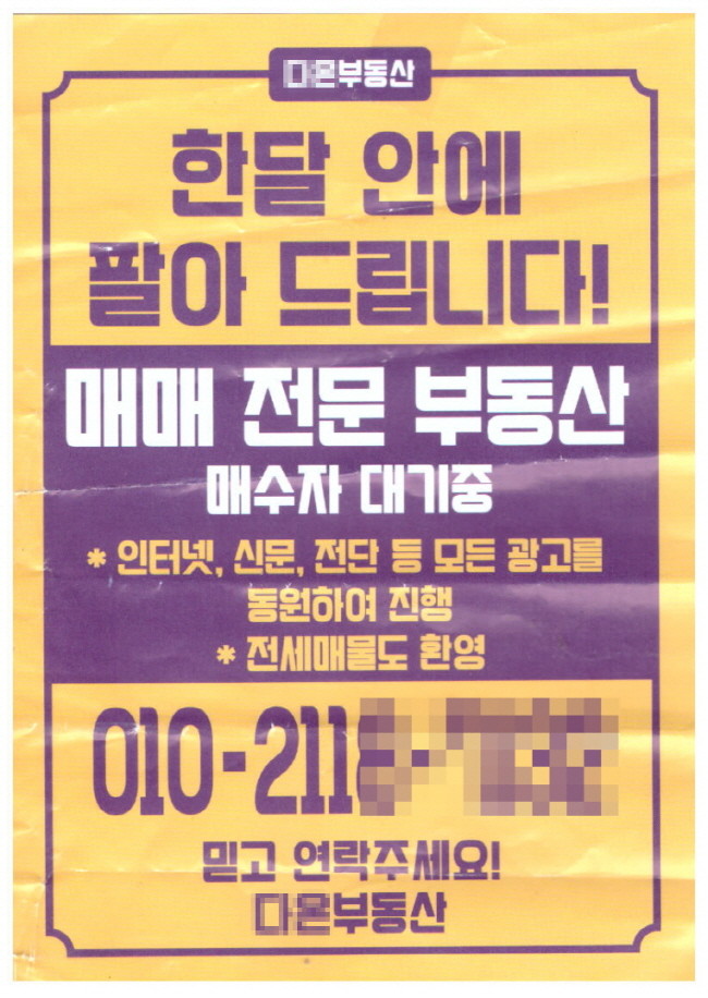 위 광고물은 공인중개사무소 소재지도 공인중개사의 이름도 없이 버젓이 공인중개사인양 장사를 하고 있는 불법의 행태를 고스란히 보여준다.