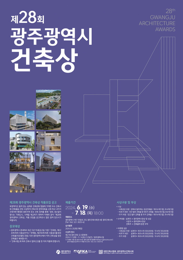 - 디자인‧시공‧공간 유용성 등 평가…최우수 등 6개 작품 선정 [세계타임즈=광주시 손권일 기자] 광주광역시(시장 강기정)는 19일부터 7월 18일까지 ‘제28회 광주광역시 건축상’ 공모를 진행한다.