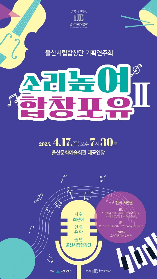 특히 음향반사판을 걷어내고 더해진 화려한 무대 세트를 비롯해 조명과 영상을 활용하고 창의적인 무대연출이 버무려진 실험적 합창 공연으로 울산시립합창단만의 새로운 매력을 경험할 수 있는 좋은 기회가 될 것으로 기대된다.