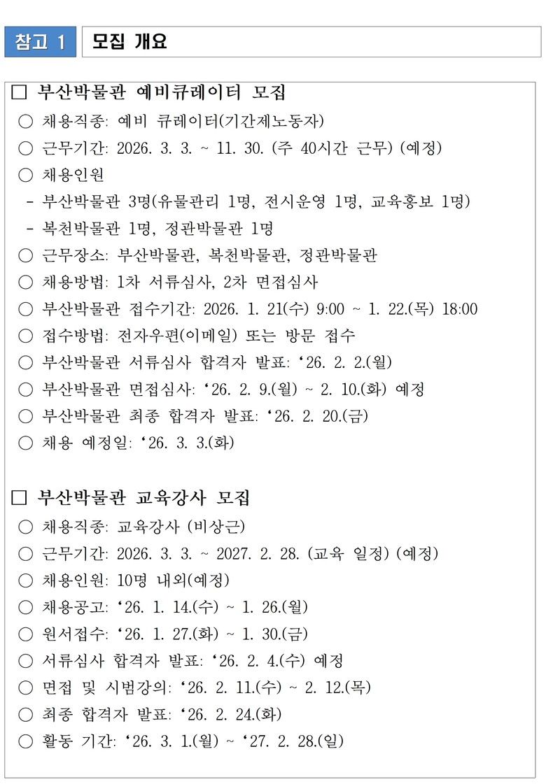 복천박물관, 정관박물관은 별도의 채용 일정을 운영하며, 자세한 내용은 각 박물관 누리집*에서 확인할 수 있다.