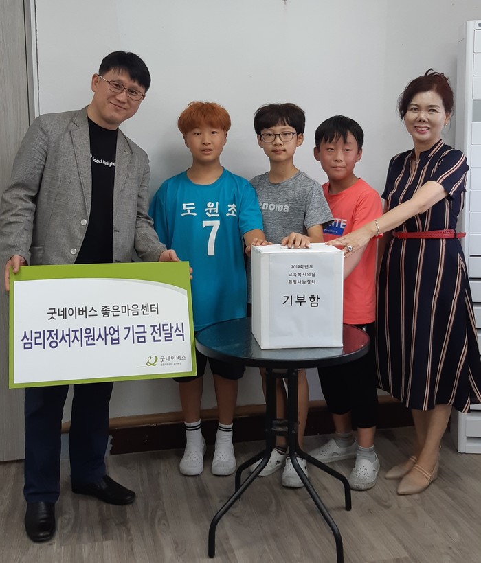 굿네이버스 경기부천지부에 전달한 심리정서지원사업 기금은 지난 7월 18일(목) 교육복지의 날을 기념하고, 경제교육 및 나눔실천을 목표로 계획된 “희망나눔장터”를 통해 얻은 판매 수익금으로, 부천지역 저소득 가정의 심리정서적 어려움을 겪는 아동들을 위해 사용될 예정이다.