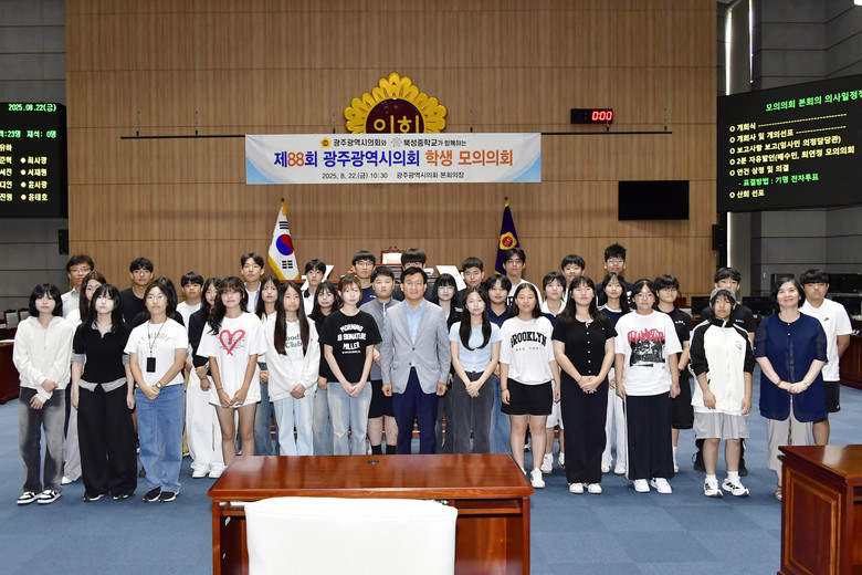 [광주 세계타임즈=손권일 기자] 광주광역시의회(의장 신수정)는 8월 22일(금) 오전 10시 30분 시의회 본회의장에서 북성중학교 학생들을 대상으로 ‘제88회 광주광역시의회 학생 모의의회’를 개최했다.