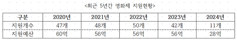 영화진흥위원회를 통한 영화제 지원예산은 기존 56억 원 규모에서 2024년 28억 원으로 50% 삭감된 바 있으며, 지원을 받는 영화제 수도 42개에서 11개로 대폭 줄어든 바 있다. 지난 8월 말 발표된 문화체육관광부의 2025년 예산안에 따르면 영화제 지원예산은 2024년 28억 원에서 다시 5억 원이 증액된 33억 원이 편성돼 있으나, 기존 지원예산 규모인 56억 원의 60%에 못 미치는 현실이다.