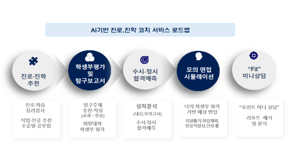 「진로·진학 AI 코치」는 학년별 로드맵을 통해 단계적으로 진로·진학 정보를 제공한다. 중학교 1학년은 심리검사 기반 진로 탐색부터, 고등학생은 탐구 주제 추천과 학생부 평가, 수험생은 수시·정시 합격 예측과 AI 모의 면접까지 학년에 맞는 서비스를 이용할 수 있다.