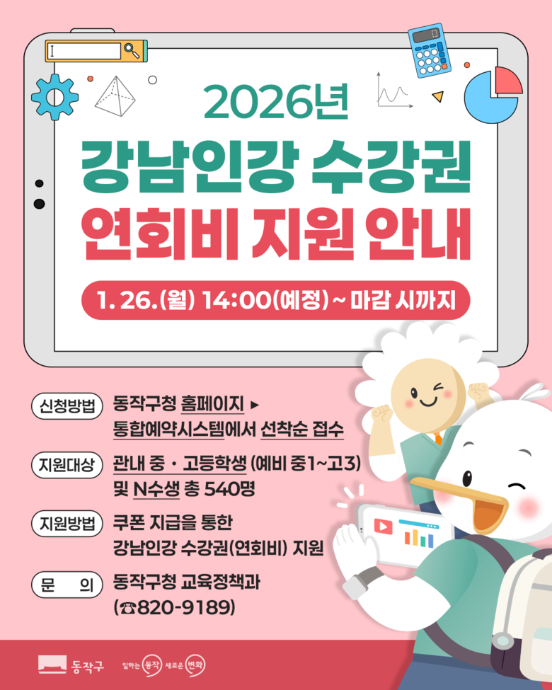 신청은 1월 26일부터 마감 시까지 동작구 홈페이지 통합예약시스템을 통해 가능하며, 총 540명을 선착순 모집한다.