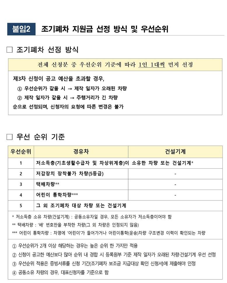 시는 그간 일부 신청자가 다수의 조기폐차 물량을 선점하여 보조금이 조기에 마감되는 상황을 개선하기 위해 지난 2차 지원부터 ‘저소득층 우선지원’ 요건을 도입했다.