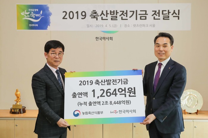 1974년 축산발전기금이 설치된 이래 한국마사회가 납입한 누적 총액은 2조 8,448억 원이다. 축산발전기금의 대부분인 98%에 해당하는 금액으로, 축산업 발전에 중추적인 역할을 수행하고 있다.