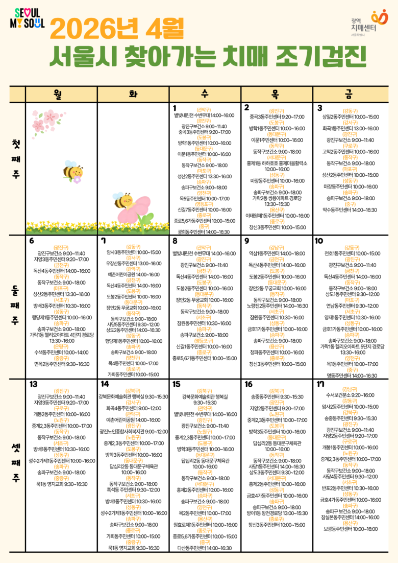평소 치매안심센터 방문이 어려운 어르신을 위해 25개 자치구와 함께 찾아가는 검진 서비스를 대대적으로 확대한다. 전문 인력이 경로당, 복지관, 탑골공원 등 어르신들이 주로 이용하는 생활 거점을 직접 찾아가 치매 선별검사와 1:1 맞춤형 상담을 제공한다.