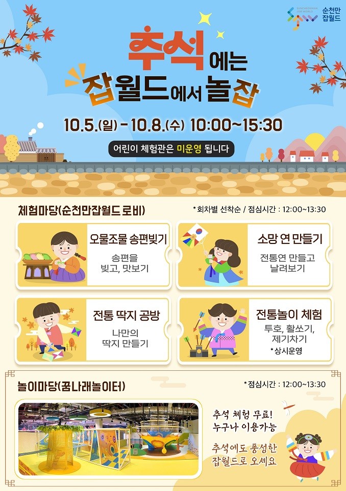 이번 이벤트는 추석 연휴를 맞아 어린이와 가족이 함께 즐길 수 있는 세대 공감 전통문화 체험 마당으로 마련됐다. 체험은 사전 예약 없이 무료로 운영되며, 방문객에게 다채로운 체험과 잊지 못할 명절의 추억을 선사할 예정이다.