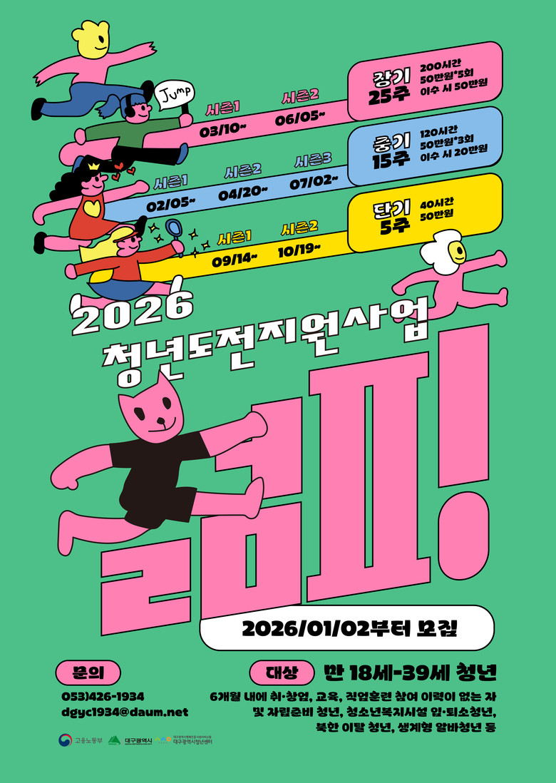 박윤희 대구광역시 청년여성교육국장은 “청년도전지원사업은 취업 과정에서 잠시 멈춰 선 청년들이 다시 자신감을 찾고 재도전에 나설 수 있도록 돕는 맞춤형 지원 정책”이라며 “지역 청년들의 많은 관심과 참여를 부탁드린다”고 말했다.
