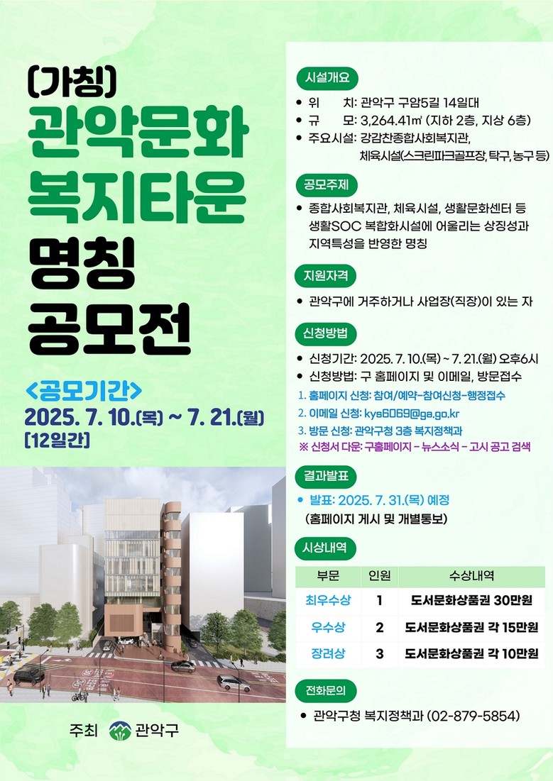 - ▲최우수상 1명 ▲우수상 2명 ▲장려상 3명 선정 및 부상 지급 [관악구 세계타임즈=이장성 기자] 관악구(구청장 박준희)가 올해 하반기 중 개관 예정인 ‘관악문화복지타운(가칭)’의 새로운 명칭을 오는 21일까지 공모한다.