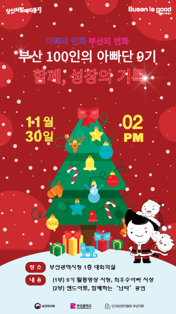시는 내년에도 10기 「부산 100인의 아빠단」을 모집하며, 부산형 육아친화마을 사업 내 구·군 육아아빠단 사업을 더 확대해 지역별 맞춤 육아 프로그램을 운영할 계획이다.