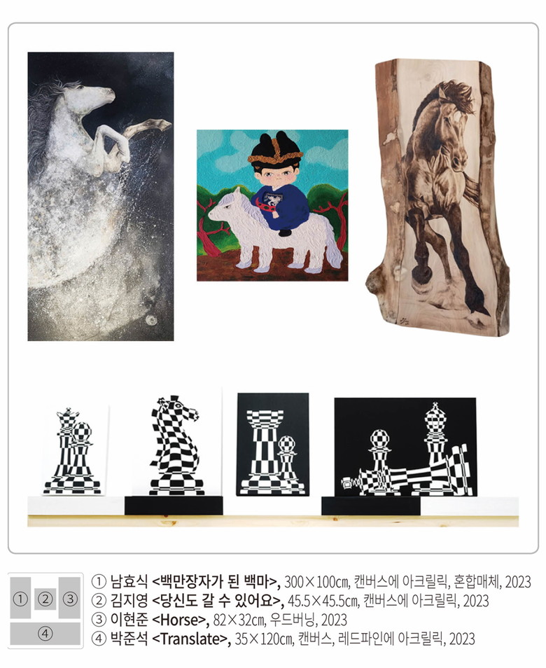 김지영 작가는 산업사회 이전 인간과 말의 긴밀한 관계를 전통혼례라는 소재에 초점을 맞추어 정감 있는 화면으로 풀어낸다. 남효식 작가는 말과 관련된 역사적 서사를 바탕으로 개인의 경험과 감정을 투입해 인간 삶의 본질을 투영하고, 박준석 작가는 말의 이미지 패턴과 흑·백의 체스(장기) 이미지를 통해 산업사회에 만연한 물질주의를 나타낸다. 마지막으로 이현준 작가는 추상 표현과 텍스트를 사용하여 말(馬)과 말(言)의 관계를 유희적으로 표현한다.
