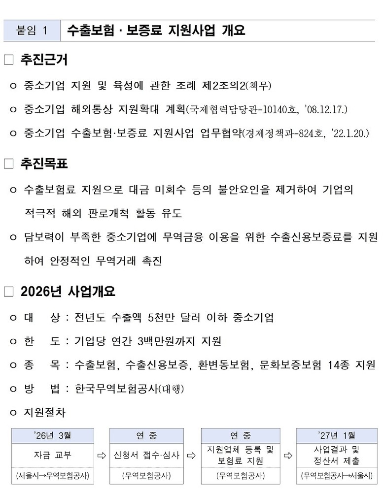 이에 시는 ’26년 2월부터 12월까지 총 16억 원(1,600백만 원) 규모로 수출보험·보증료 지원사업을 추진한다.