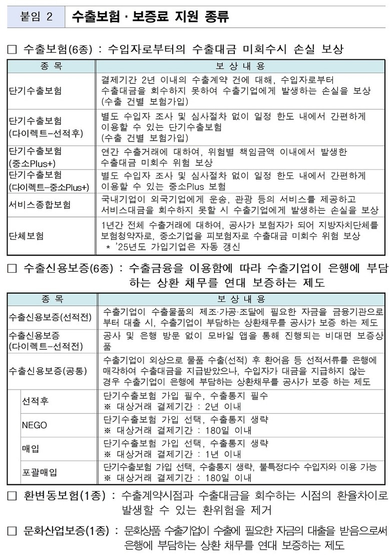 지원 대상은 전년도 수출액 5천만 달러 이하 중소기업이며, 수출보험 6종·수출보증 6종·환변동보험 1종·문화산업보증 1종 등 총 14종의 수출보험·보증 상품에 대해 보험료와 보증료를 지원한다.