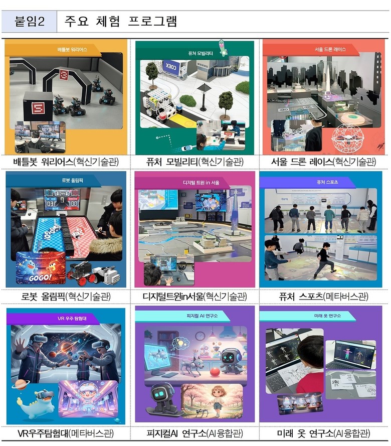 올해는 로봇·드론 및 피지컬AI 등 최신 산업트렌드를 반영해 관별 내용을 전면 개편했다. 이에 따라 혁신기술 체험관(1월 6일), 메타버스 체험관(2월 1일), 창의교육관(3월 13일)을 순차적으로 개관했고, AI융합관 개편을 끝으로 4개관 전체 재단장을 완료했다.