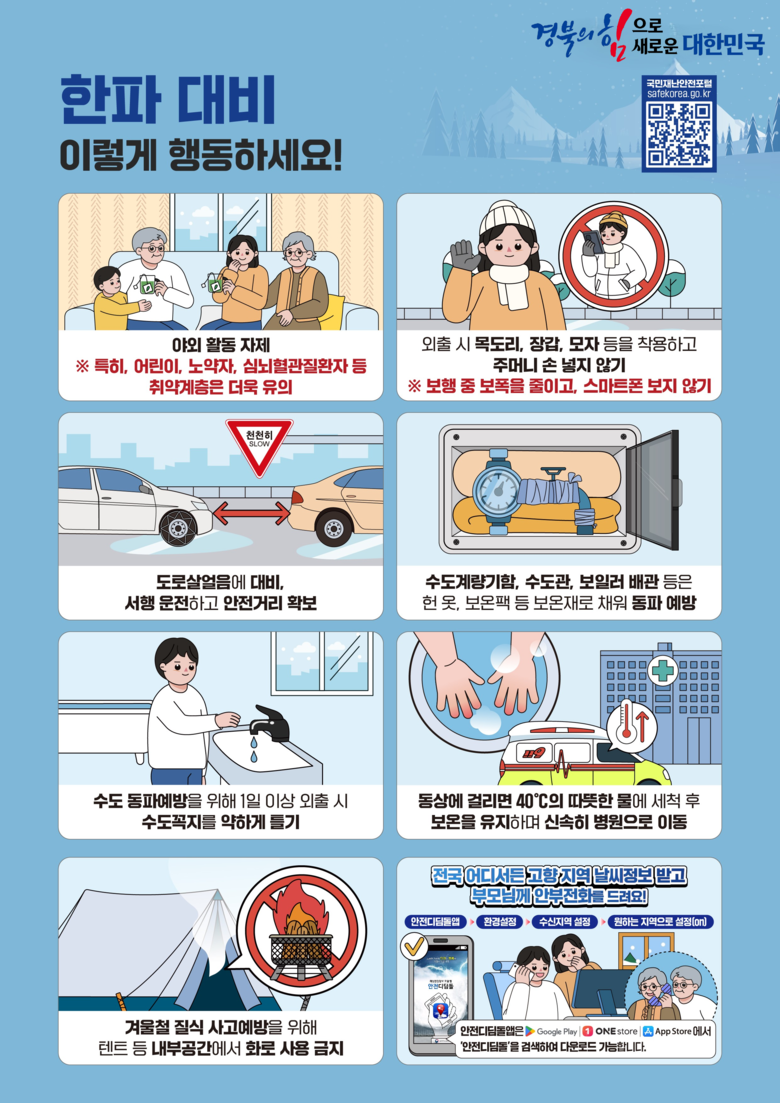 김종수 경상북도 안전행정실장은 “이번 한파에 대한 도민 피해와 불편이 최소화하도록 취약계층 관리, 시설물 안전조치 등 안전대책을 추진”해 줄 것을 강조하면서“도민 여러분께서도 한파로 인한 피해 예방을 위해 국민 행동 요령을 반드시 지켜 주실 것”을 당부했다.