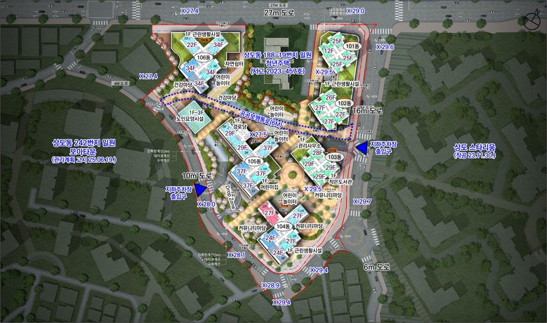 대상지 동측 상도로 22길 및 남측 성대로1가길을 확대해 교통환경을 개선하고, 인근 개발 대상지와 공공보행통로를 연결해 보행의 연속성을 확보하였다.
