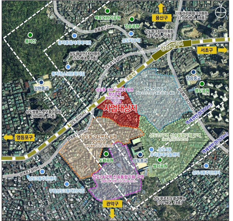 대상지는 지하철 7호선 장승배기역 인근에 위치하며 역세권 장기전세주택(상도스타리움) 및 모아타운(상도동 242번지 일대), 신속통합기획(상도14,15,23구역) 등 개발사업이 활발하게 진행 중으로, 인접개발 구역과 함께 역세권 장기전세주택 사업 추진을 통해 장승배기역 역세권 지역의 주택공급 확대 및 공간구조 재편을 하고자 한다.
