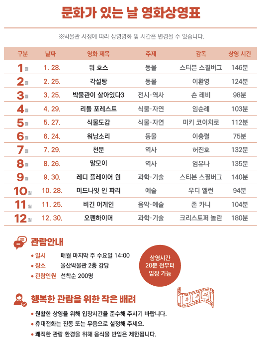 울산박물관 관계자는 “영화 상영 프로그램을 통해 박물관을 더욱 친근하게 경험할 수 있는 문화 공간으로 만들고, 일상에서 문화를 즐기는 ‘유(U)잼도시 울산’의 매력을 시민들과 공유하고자 한다”며 “많은 시민들이 박물관에서 영화와 전시를 함께 즐기시길 바란다”고 말했다.