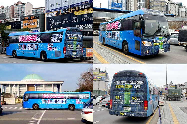 해당 랩핑버스는 내달 4일까지 운행하며 지난 11월 12일 신천지 예수교회가 운영하는 시온기독교선교센터를 통해 108,084명이 수료한 소식을 전한다.