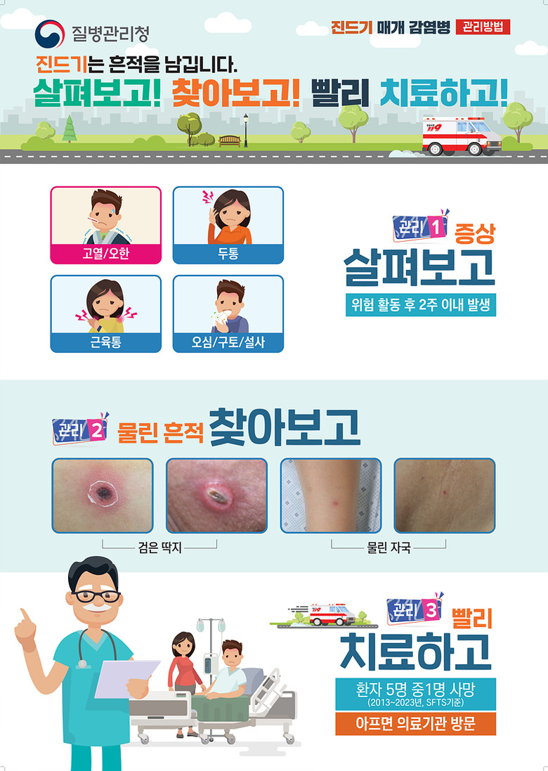 정의관 대구광역시 보건복지국장은 “야외활동이 늘어나면서 진드기에 노출될 가능성이 증가하고 있는 상황으로 야외활동 시 예방 수칙을 준수할 것”을 당부했으며, “대구시는 환자 및 사망자 감소를 위한 예방 교육 및 홍보를 위해 포스터, 리플릿, 교육용 캘린더, 배너, 동영상 등 홍보자료 16종을 관내 학교, 군부대, 경찰서, 시·군 농업기술센터 등 유관기관에 배포하고, 의심 환자 발생 감시를 강화할 계획”이라고 말했다.