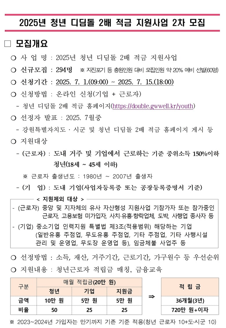 - 7월 1일(화)부터 15일(화)까지 청년 디딤돌 2배 적금 홈페이지 통해 신청 가능 [강원도 세계타임즈=김민석 기자] 강원특별자치도(도지사 김진태)는 청년 근로자의 경제적 자립과 자산형성 기회를 제공하고, 기업에게는 고용 안정과 장기 재직을 기대할 수 있는 「2025년 청년 디딤돌 2배 적금 지원사업」 2차 모집을 시행한다고 밝혔다.