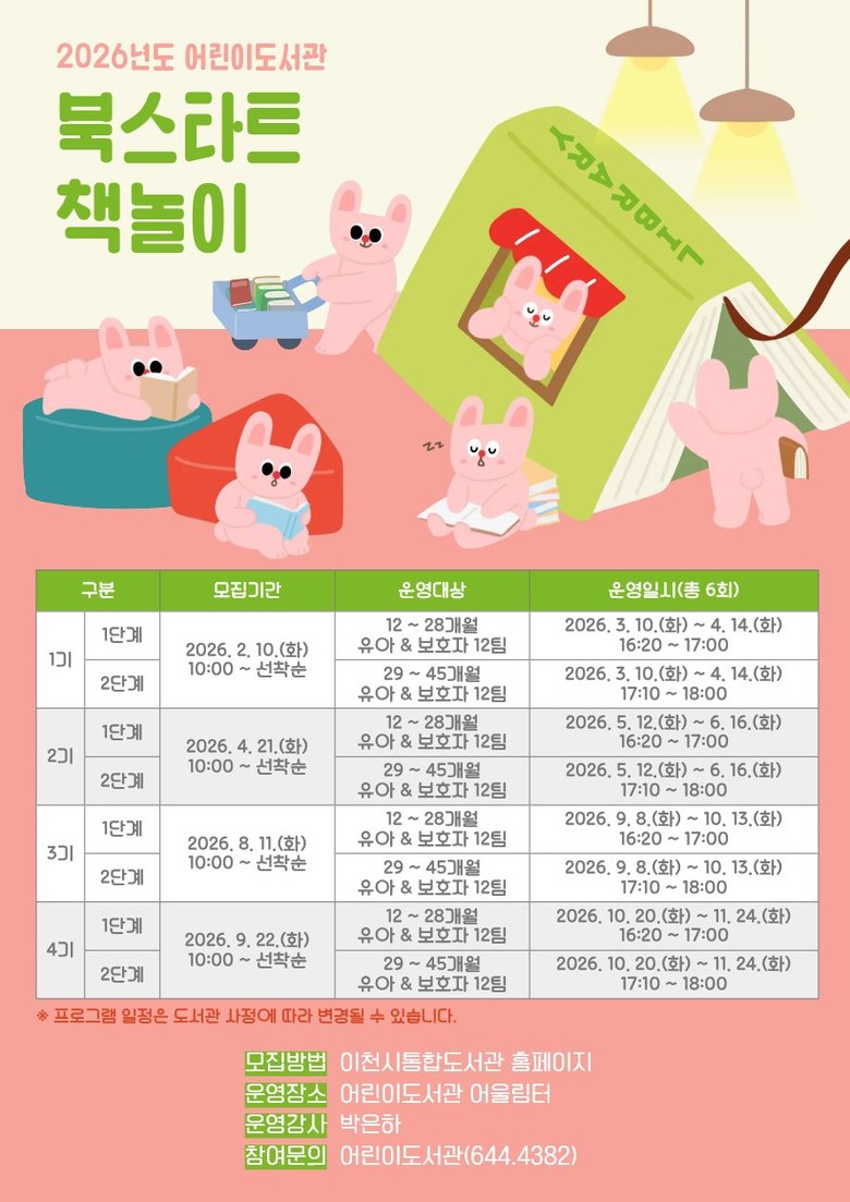 이번 프로그램은 3월부터 11월까지 총 4기, 2단계 반으로 구성된다. 참여 대상은 ▲1단계: 12 ~ 28개월 유아와 보호자, ▲2단계: 29 ~ 45개월 유아와 보호자이다. 1기 참여 신청은 2월 10일(화) 오전 10시부터 이천시통합도서관 누리집(www.icheonlib.go.kr)을 통해 선착순으로 가능하다.