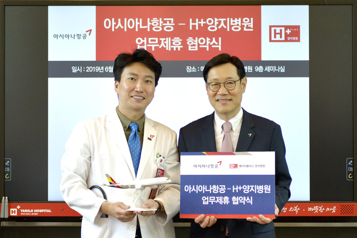 에이치플러스 양지병원(병원장 김상일) 과 아시아나항공(사장 한창수)은 26일 외국인 및 해외동포에게 건강검진과 항공료 할인혜택을 제공하는 업무협약을 체결했다.