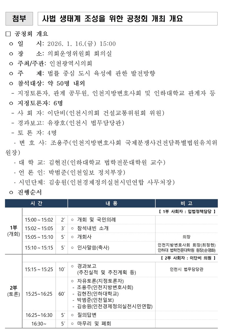 공청회는 인천시 법무담당관의 인천고등법원 유치 후속 추진계획 경과보고를 시작으로 자유토론 방식으로 진행된다.