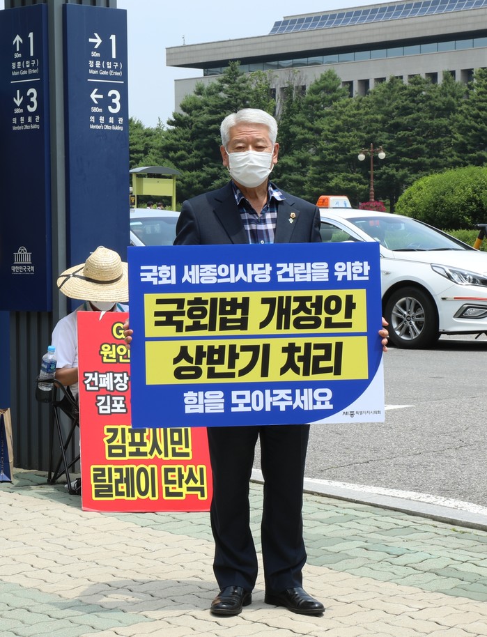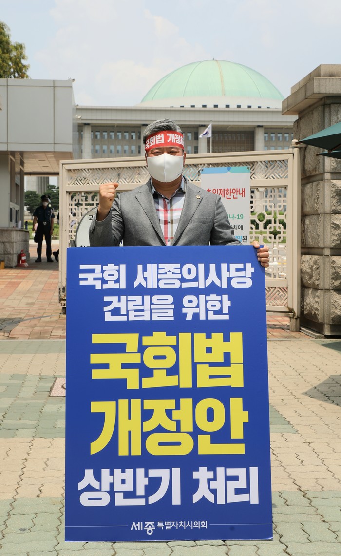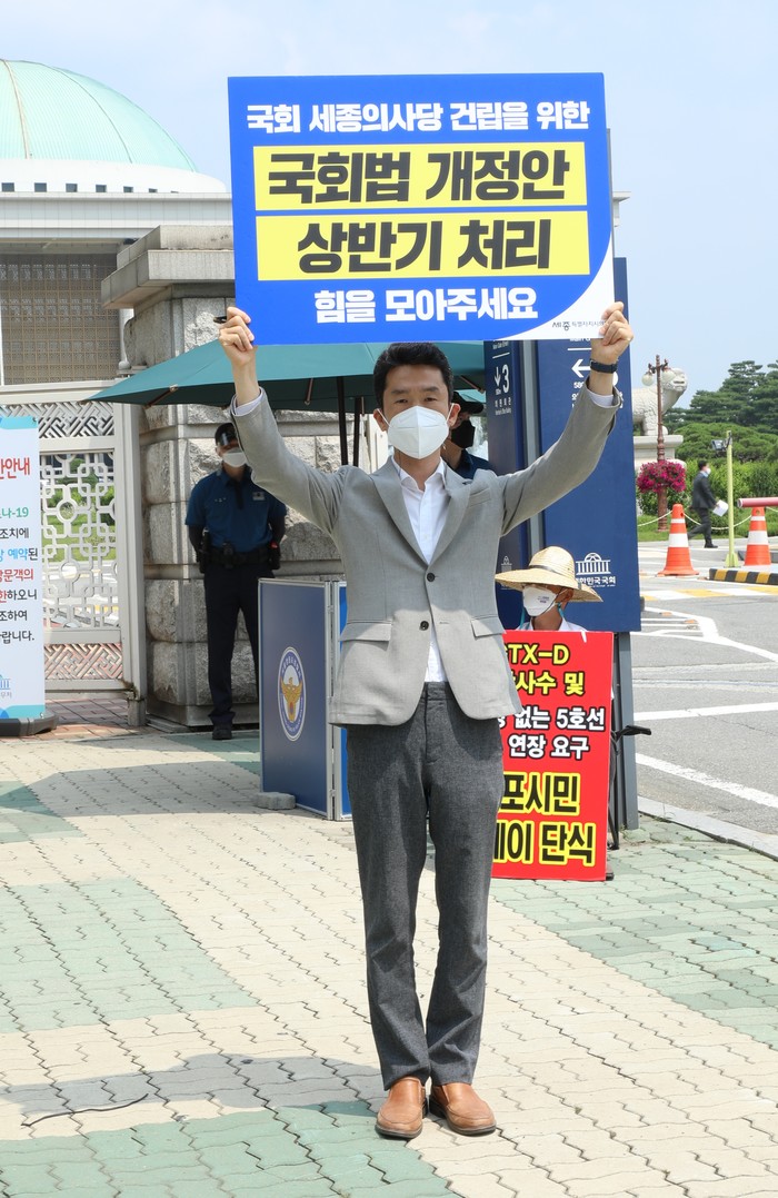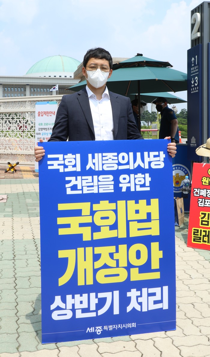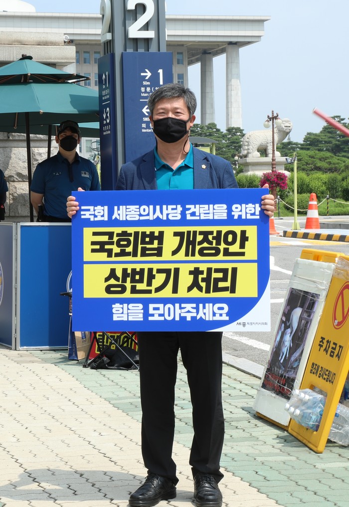세종특별자치시의회 ‘행정수도완성 특별위원회(위원장 유철규, 이하 행수특위)’는 24일 여의도 국회의사당 앞에서 국회법 개정을 촉구하기 위한 1인 릴레이 시위를 했다.