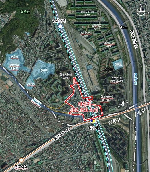 대상지는 지하철 환승역인 석계역 일대로, 역세권 중심기능 및 연결기능 강화를 목표로 82,158㎡ 규모의 지구단위계획구역 신설 계획을 수립하였다.
