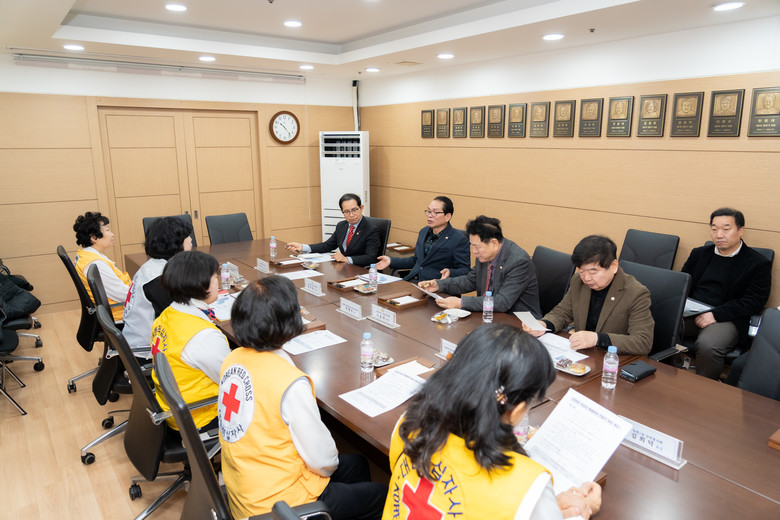 | ▲ 강남구의회 의원들과 대한적십자사 강남지사 관계자들이 이야기를 나누고 있다.(오른쪽 위에서 3번째 이호귀 의장, 2번째 복진경 부의장, 4번째 이동호 운영위원장, 1번째 강을석 행정안전위원장) |