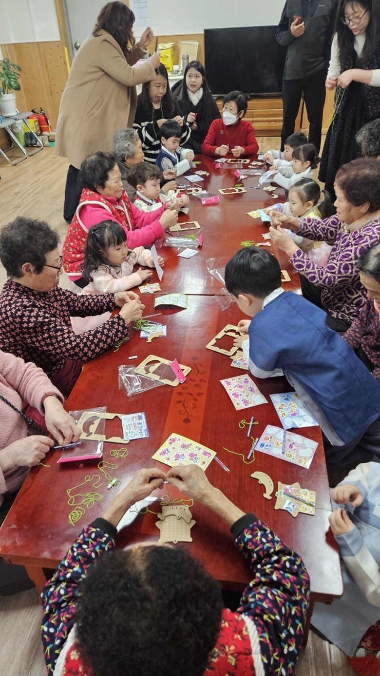 이날 원아들은 서툰 자세로 세배를 올리며 어르신들께 건강과 안녕을 기원했다. 어르신들은 환한 미소로 덕담을 건네며 화답했다. 경로당에서는 풍경 만들기와 전통 팽이치기 체험이 진행돼 아이들과 어르신이 함께 참여했다.