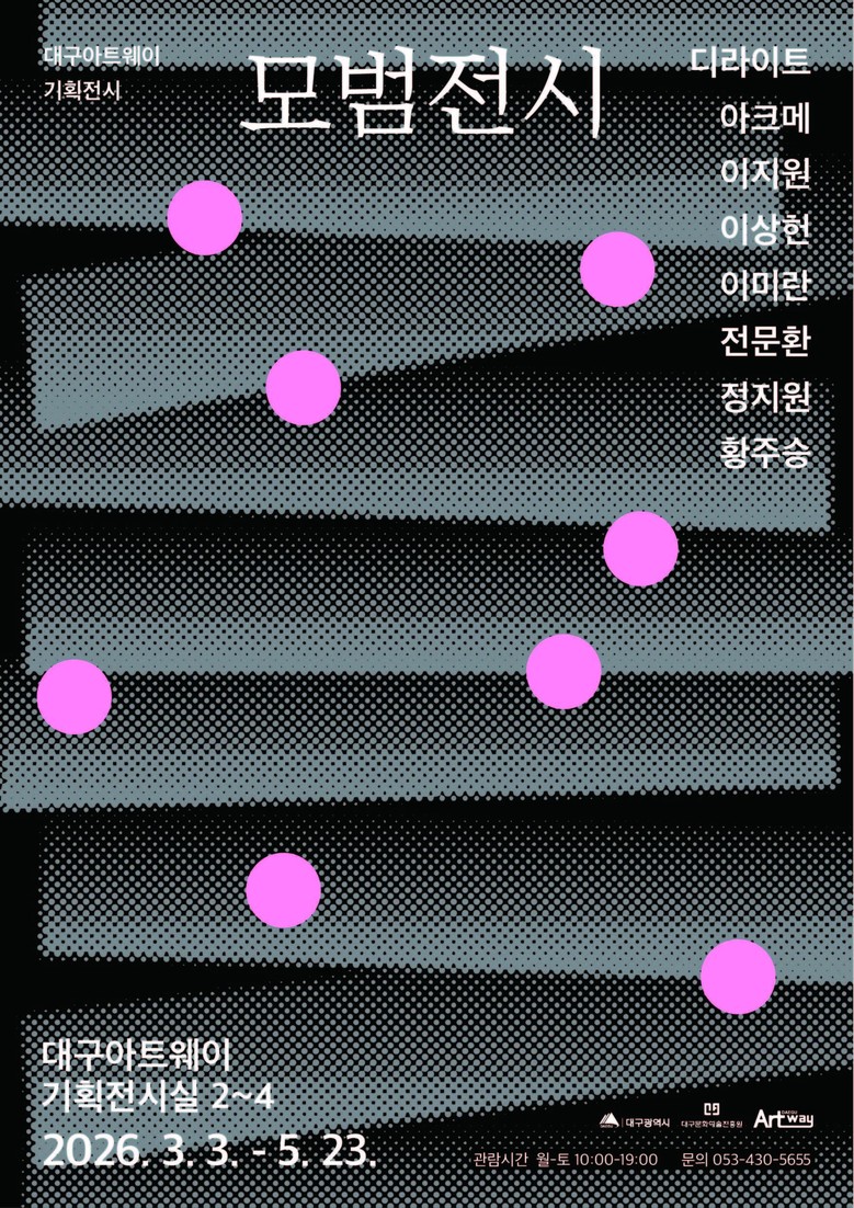 ▸ 작가 참여형 워크숍·도슨트 운영… 시민과 예술가가 만나는 생활 속 전시 [세계타임즈=대구 한윤석 기자] 대구문화예술진흥원 문화예술본부(본부장 방성택)가 운영하는 대구아트웨이는 올해 제1차 기획전시 <모범전시>展(전)을 오는 3월 3일부터 5월 23일까지 대구아트웨이(이하 아트웨이) 기획전시실 2~4실에서 개최한다. 이번 전시는 2026년도 입주작가로 선정된 8인을 공식적으로 소개하는 첫 자리다.